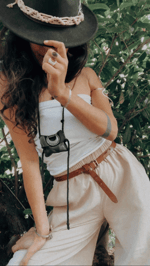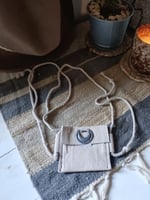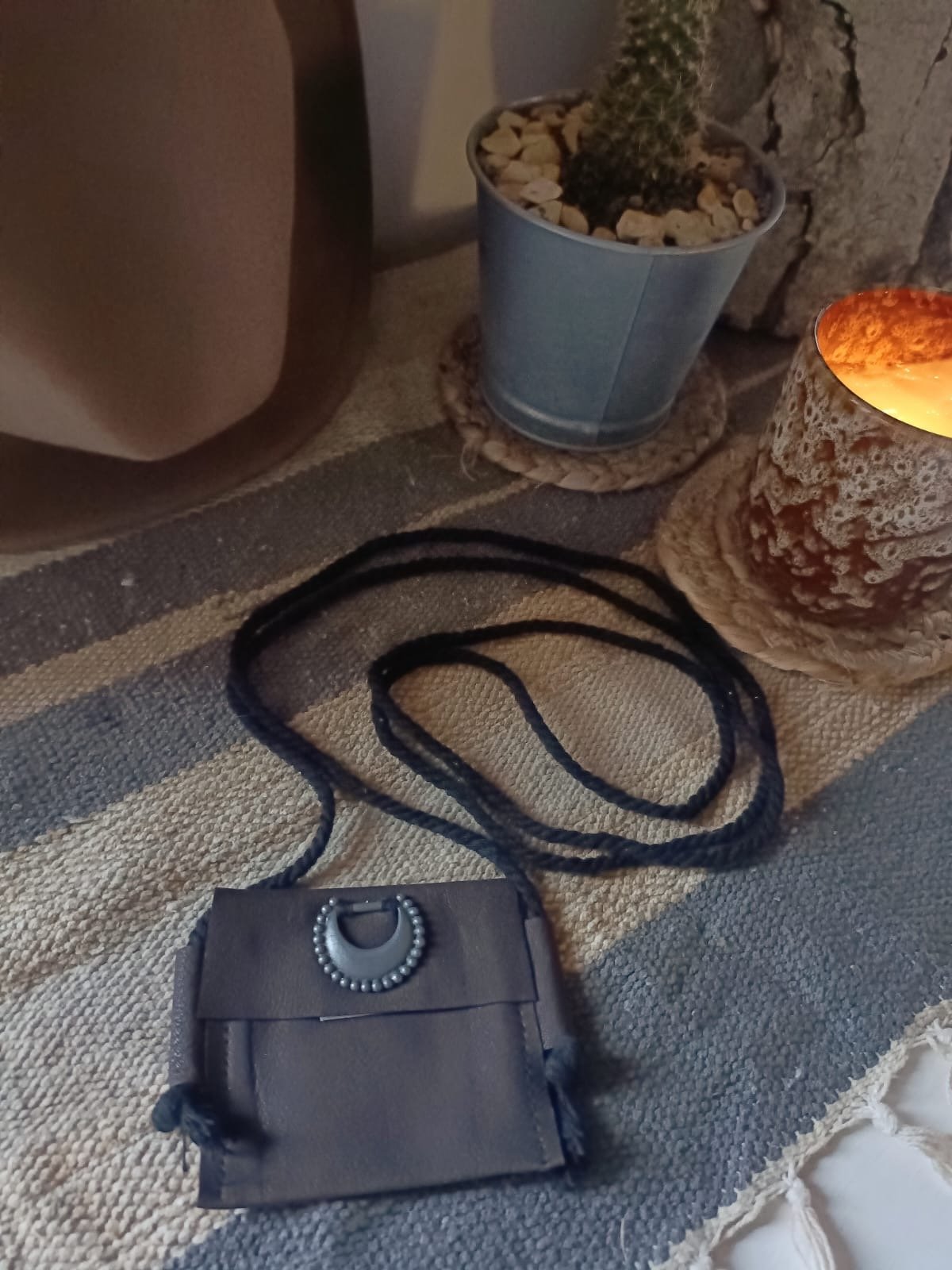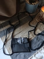 Realizzato con pelle di recupero, il cordino è in cotone e placchette metalliche assortite applicate sul davanti della collana.