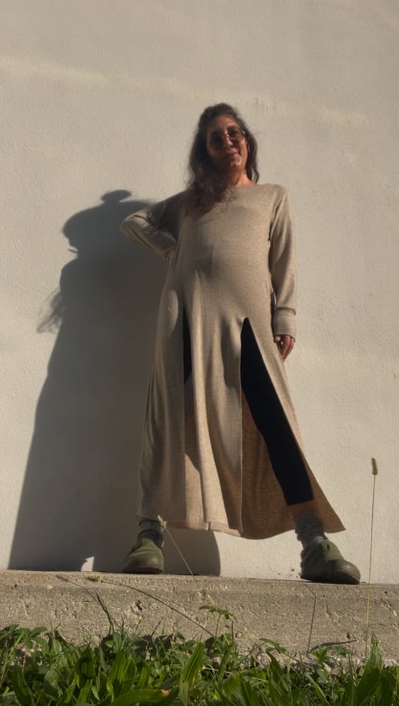 Le maniche lunghe e il taglio rilassato rendono l’abito adatto a un utilizzo quotidiano, ma facilmente trasformabile anche per occasioni più curate.